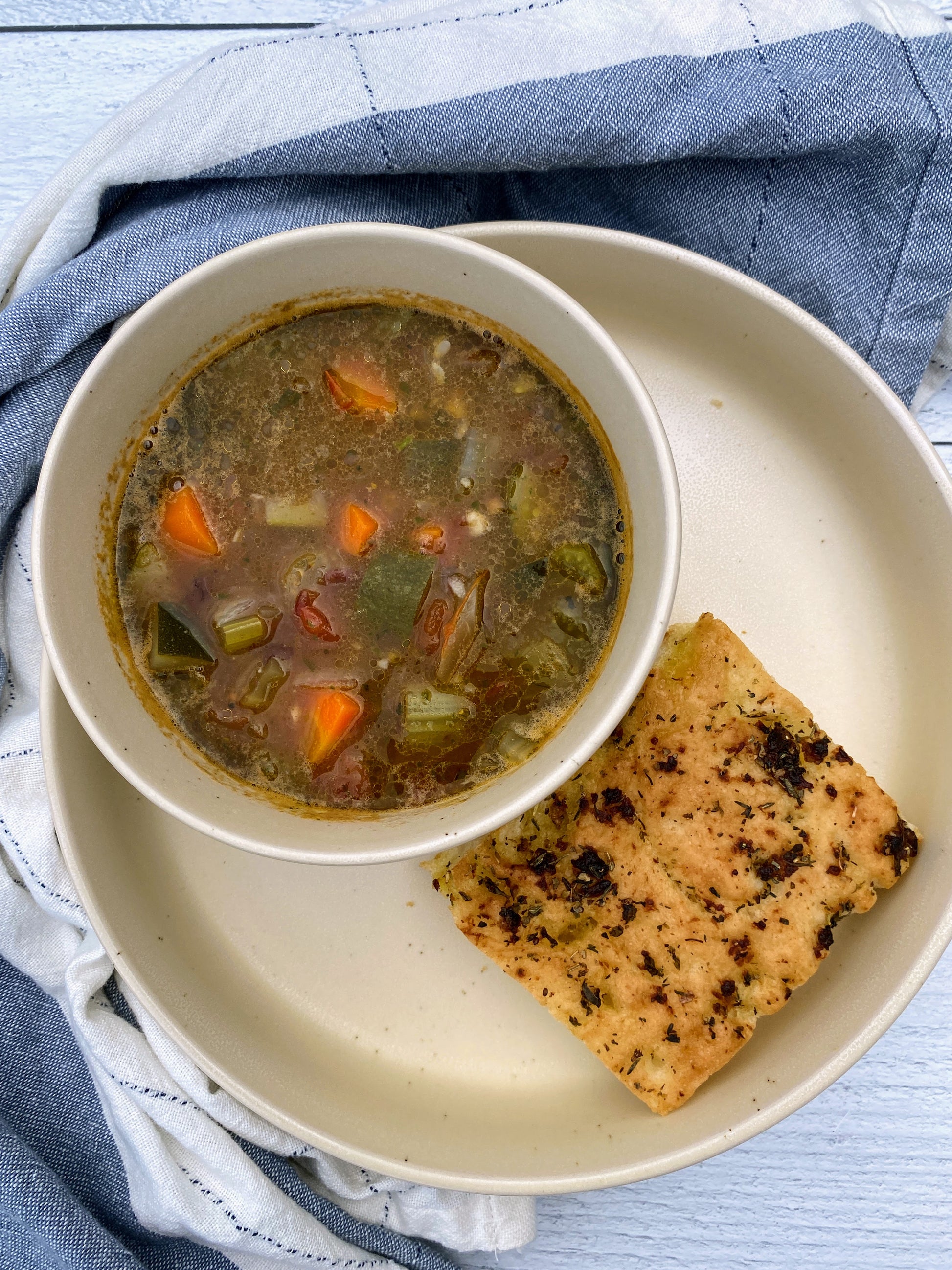 This Minestrone soup is a crowd pleaser, chock full of fresh veggies- like tomatoes, zucchini, carrots, celery, spinach, garlic & onions. Plus freshly cooked- never canned- kidney beans & GF quinoa based elbow pasta. Flavor is king so we add in lots of fresh herbs to keep it rich & complex, like garden fresh rosemary, oregano & finished with a basil infused olive oil. Served with a slice of our freshly baked GF Garlic & Herb Focaccia Bread.