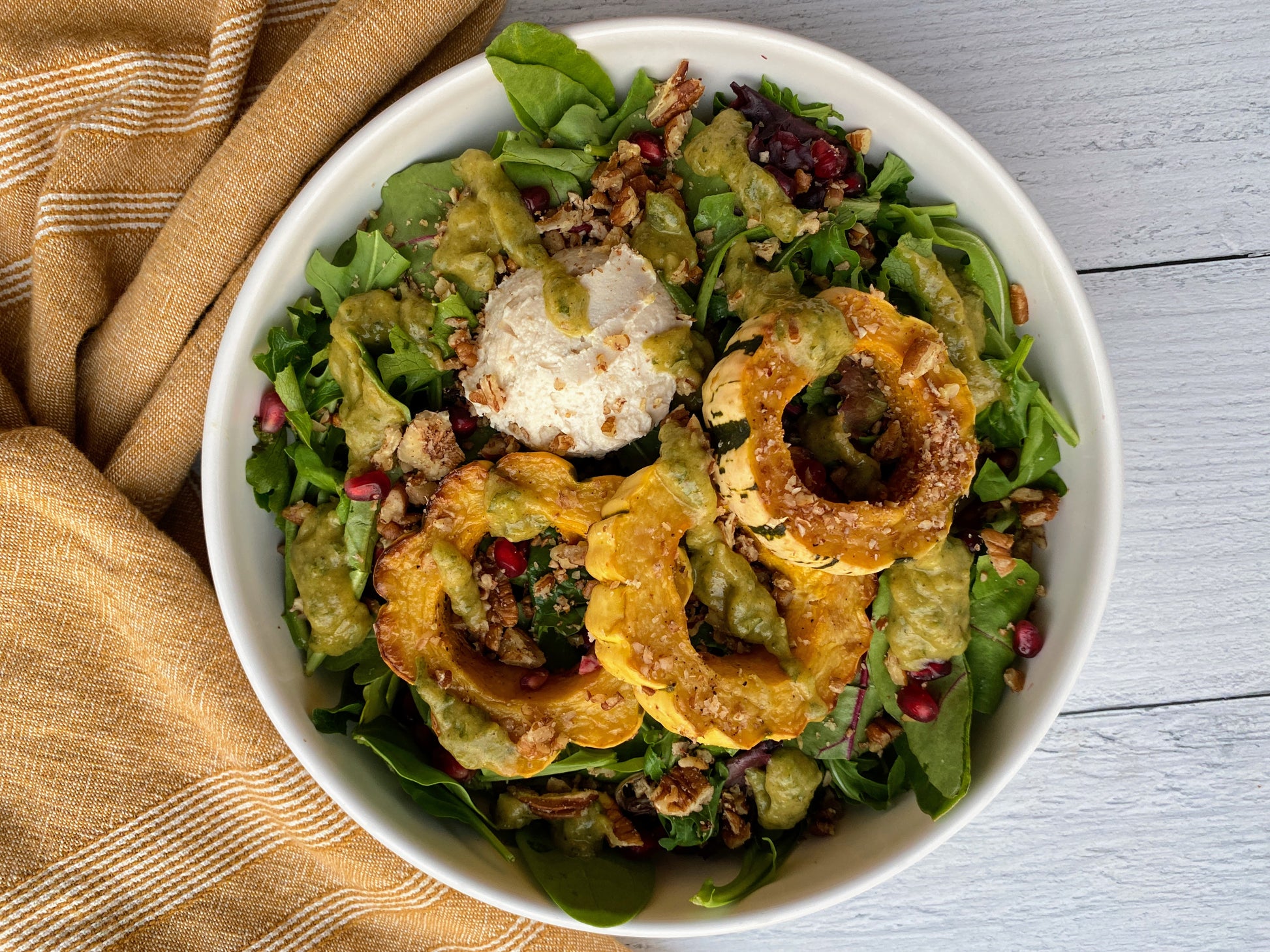 ROASTED DELICATA SQUASH, POMEGRANATE & CHEVRE SALAD