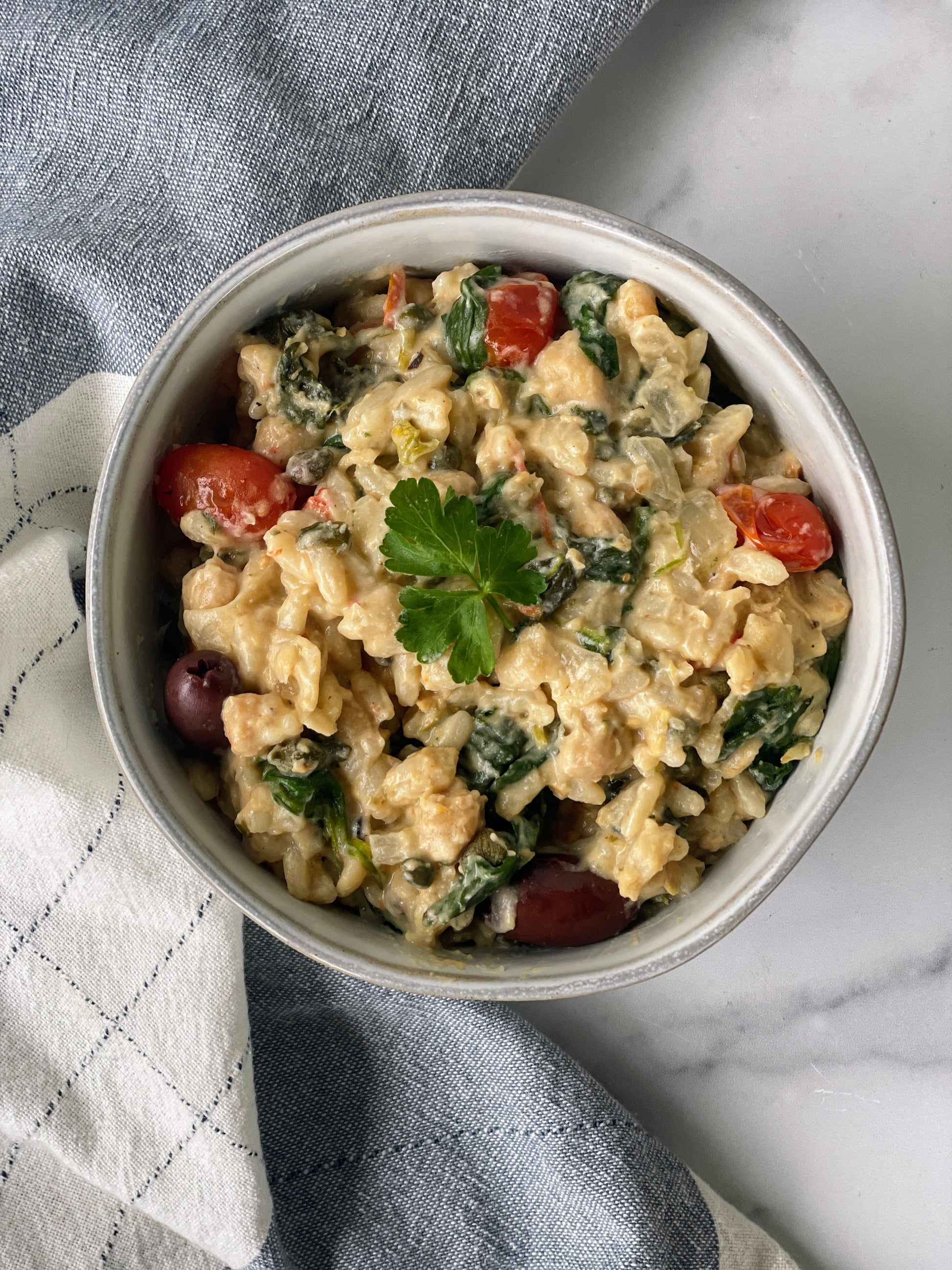 The bright, briny flavors of the Mediterranean come together in this nourishing grain bowl. Juicy grape tomatoes, capers, and Kalamata olives are simmered with garlic, onions, and herbs, then folded into tender brown rice. Finished with roasted red peppers, protein-rich chickpeas, fresh spinach, parsley, and our tangy house-made cashew feta.