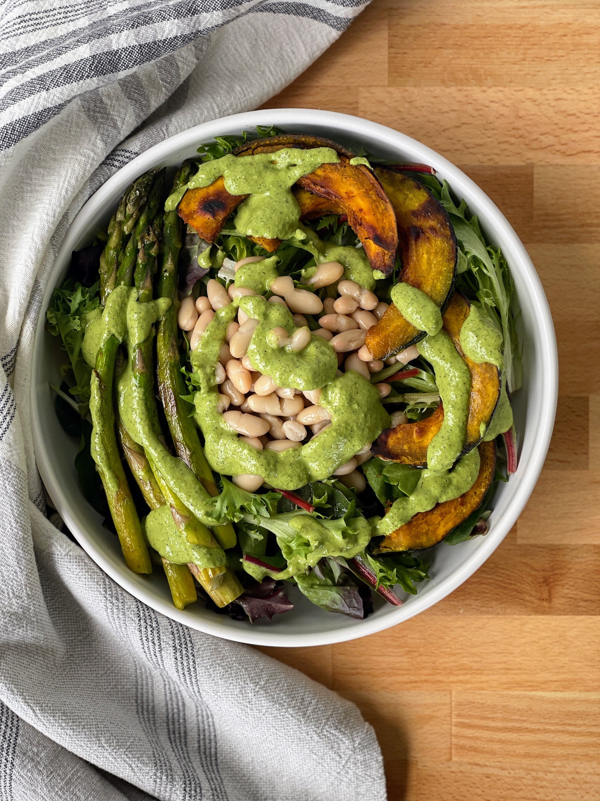 with Tuscan White Beans, Roasted Kabocha Squash, Asparagus & Green Goddess Dressing