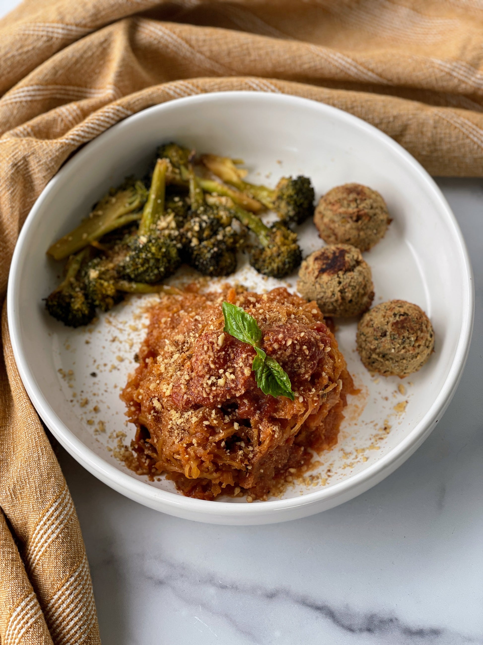 A comforting Italian-inspired classic. Our savory chickpea-based “meatballs” are served over a bed of creamy, slow-cooked polenta with Nana’s herbaceous marinara sauce to pour all over. Finished with walnut parm and fresh basil. On the side, garlicky roasted broccolini for the perfect balance of greens and rustic comfort food.