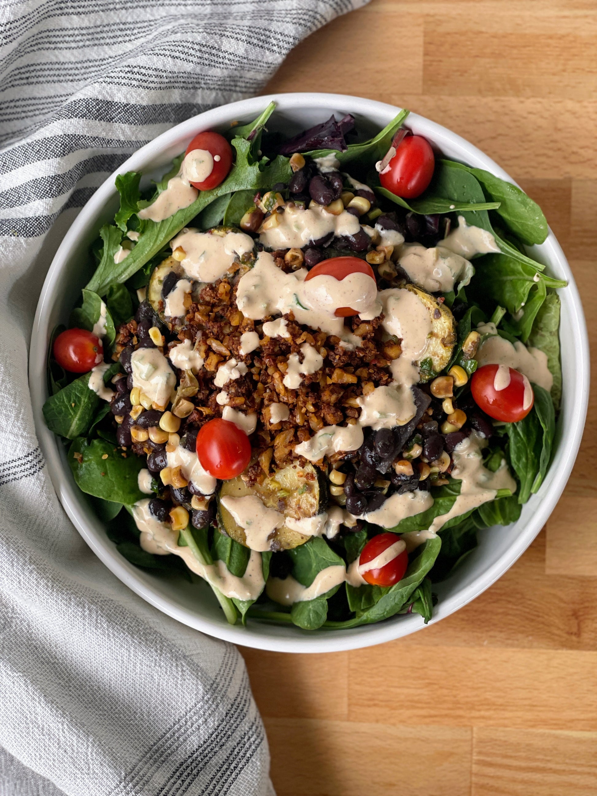 “Tres Hermanas” is a traditional combination of the 3 “sister” crops- corn, beans & squash- which many indigenous communities in central & south America have grown and eaten together to nourish themselves for thousands of years. When the “Three Sisters” are planted together they help each other grow, like sisters :) There are many unique recipes, this one is seasoned with chipotle, oregano with cilantro & lime. Weʻll also be adding in our Walnut Chorizo & grape tomatoes all served under a big bed of organic mixed baby salad greens with a side of our cashew based Chipotle Lime Crema.
