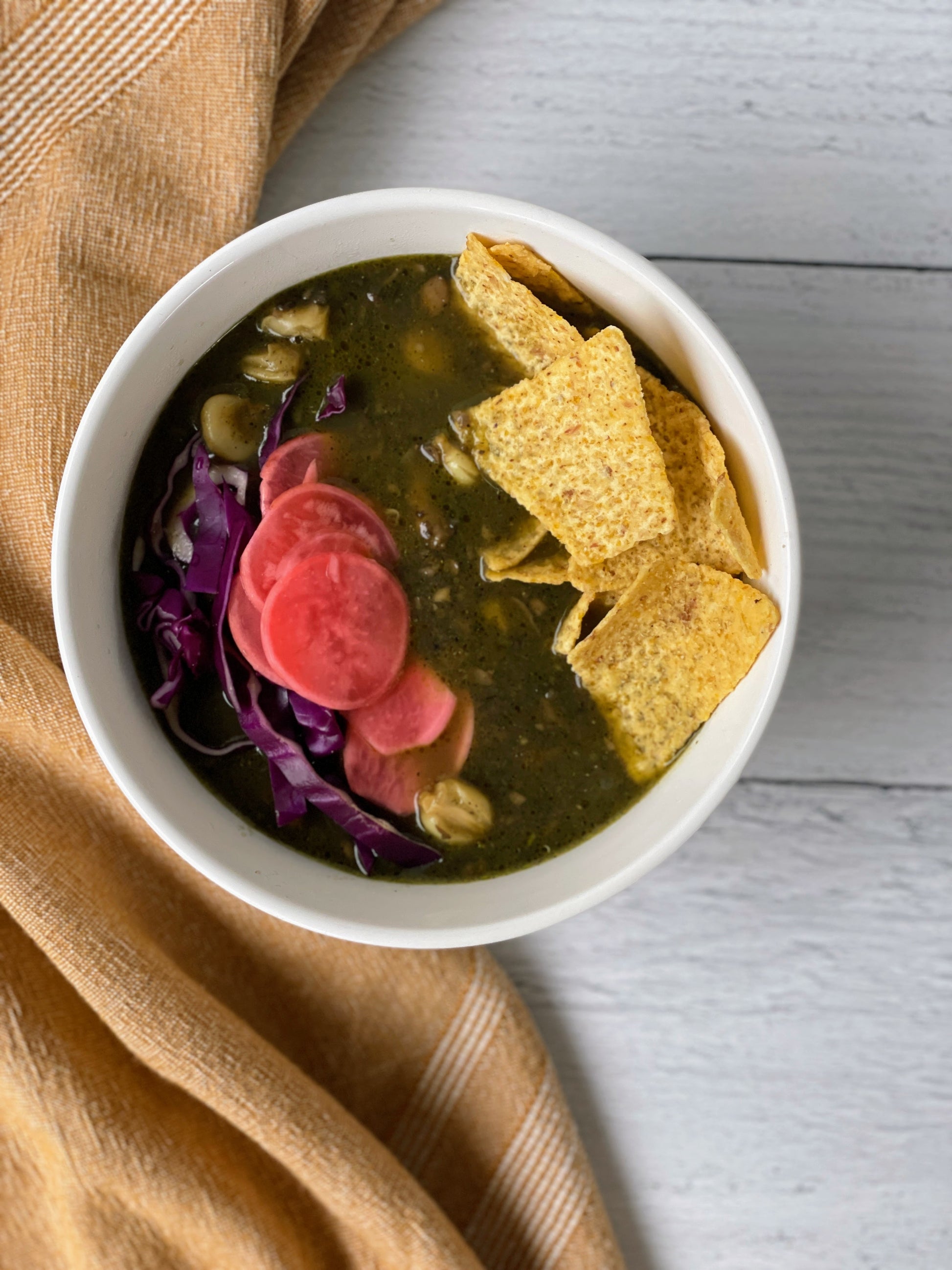 Pozole, a traditional soup of the Aztecs, was reserved for special occasions such as sacred ceremonies. There are 3 variations of broth- green, white & red. This green Pozole uses blended roasted tomatillos & seeded jalapeños as the broth base. Adding in finely chopped Small Kine Farm mushrooms gives this typically based meat soup a umami flavor & satisfying texture. The chewy & savory hominy (pozole) is a corn loverʻs dream! Served with typical Pozole toppings: thinly sliced purple cabbage, pickled local radish & tortilla chips on the side.