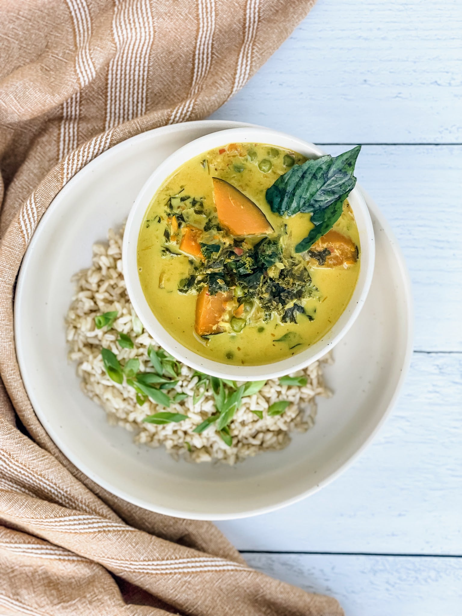 This Thai red curry is rich & flavorful with creamy coconut milk & aromatic spices like lemongrass, coriander, turmeric, ginger, garlic & onions. After the broth has simmered we add in local squash & kale with sweet peas for an extra boost of plant protein. Served with a side of organic brown jasmine rice infused with kaffir lime, lemongrass & ginger, topped Thai basil.