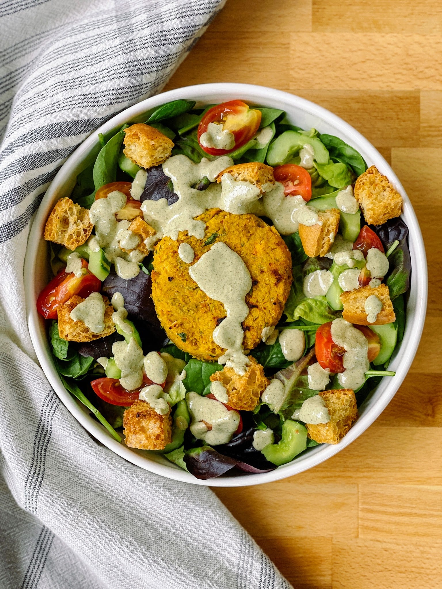 We love homemade veggie burgers, and we love hearty “eats like a meal” salads, so we’re bringing these two together in our Veggie Burger Salad! Youʻll find our chickpea & sweet potato Veggie Burger Patty, freshly made GF Focaccia Croutons, local grape tomatoes & Japanese cucumbers. All served under organic mixed baby greens with our house-made Caesar dressing on the side.