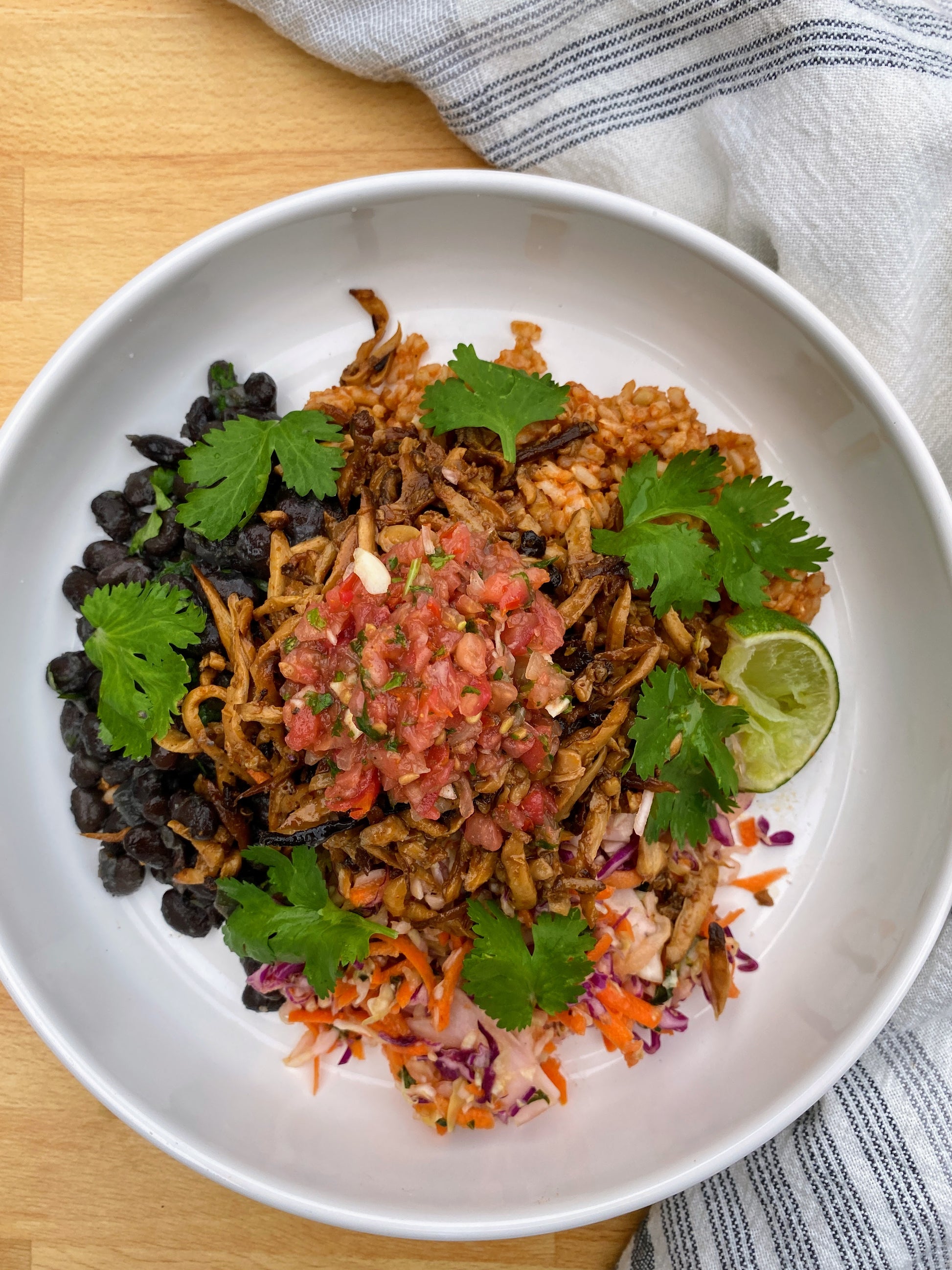 Revisit a fan favorite from our farmers market days! This hearty bowl features tender, marinated jackfruit, shredded and roasted to perfection to create that satisfying carnitas-style texture and flavor. It’s paired with slow-cooked organic black beans, fresh local tomato salsa, and our signature basil & citrus slaw for a bright, crunchy finish. All of this sits atop a bed of organic brown Mexican rice for a well-balanced and deeply nourishing meal.