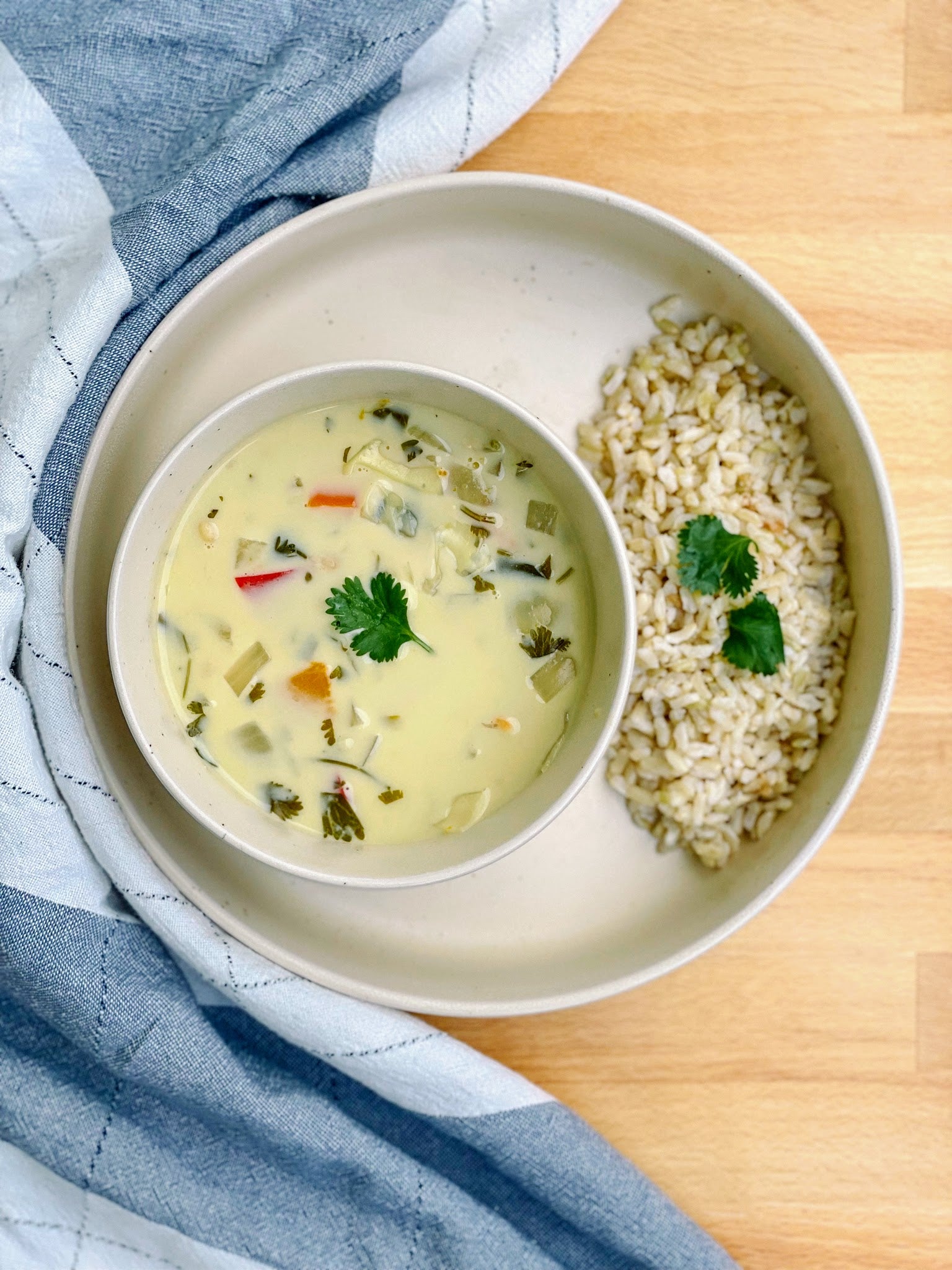 We start this classic Thai coconut soup with a 3 hr broth made from simmering fresh local lemongrass, kaffir lime, galangal (Thai ginger), garlic & onion for deep flavor. Adding in coconut milk, sweet peas & farm fresh kabocha squash, carrots, red bell pepper, cabbage & green beans. Finished with cilantro & lime, served with a side of our irresistible & aromatic Coconut Ginger Brown Basmati Rice.