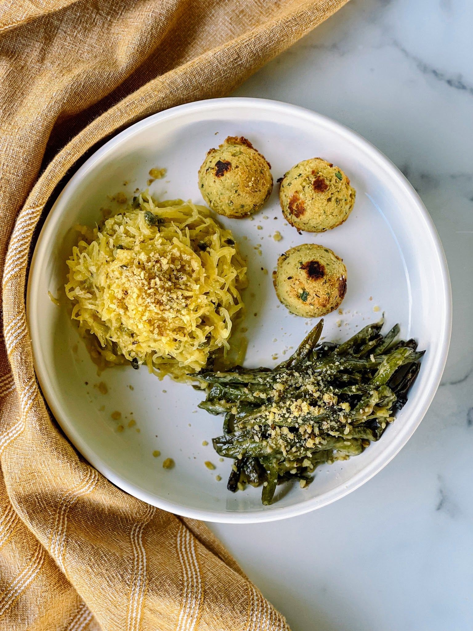 with Polenta, Chick’un Meatballs & Garlicky Broccoli
